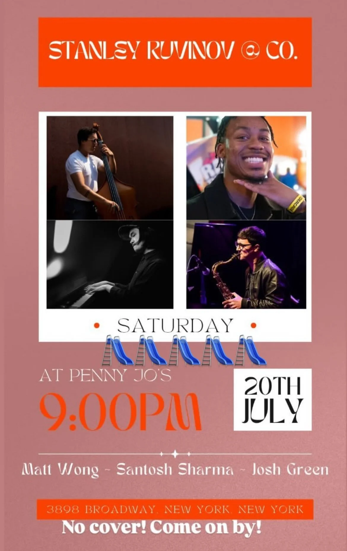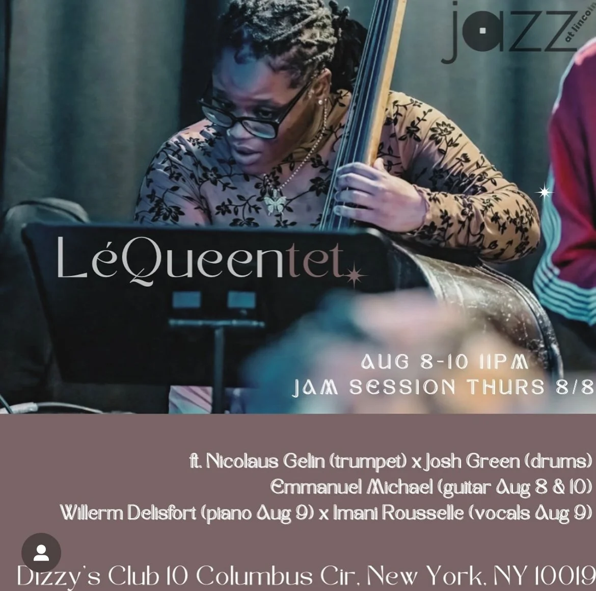 Aug 16 Jameel and Friends @ Summer Streets Saturday, August 16, 2025 12:00 PM 1:00 PM Summer Streets (map) Google Calendar ICS View Event → Aug 2 to Aug 3 Nolan Nwachukwu Project @ Dizzy’s Late Night Sat, Aug 2, 2025 11:00 PM Sun, Aug 3, 2025 12:00 AM Dizzy’s Jazz Club (map) Google Calendar ICS View Event → Aug 2 Tamieyah & Friends @ Summer Streets Saturday, August 2, 2025 12:00 PM 1:00 PM Summer Streets (map) Google Calendar ICS View Event → Aug 1 Talibah Safiyah @ BRIC Celebrate Brooklyn Friday, August 1, 2025 7:00 PM 8:00 PM Lena Horne Bandshell (map) Google Calendar ICS View Event → Jul 26 Lyric @ Brandy Melville Saturday, July 26, 2025 2:00 PM 3:00 PM Brandy Melville (map) Google Calendar ICS View Event → Jul 15 to Jul 16 Benito Gonzalez Trio Tue, Jul 15, 2025 10:30 PM Wed, Jul 16, 2025 1:00 AM The Django (map) Google Calendar ICS View Event → Jul 14 to Jul 15 Nolan Nwachukwu Project at The Django Mon, Jul 14, 2025 10:30 PM Tue, Jul 15, 2025 1:00 AM The Django (map) Google Calendar ICS View Event → Jun 1 Jameel & Friends (Stevie Wonder Tribute) Sunday, June 1, 2025 4:30 PM 7:00 PM Alke Café (map) Google Calendar ICS View Event → May 31 WBGO Next Gen Collective at Jersey City Jazz Festival Saturday, May 31, 2025 1:00 PM 2:00 PM The Clubhouse by Ford's Gin (map) Google Calendar ICS View Event → May 30 Benito Gonzalez Trio at the Django Friday, May 30, 2025 7:00 PM 10:00 PM The Django (map) Google Calendar ICS View Event → Dec 21 stanley ruvinov and co Saturday, December 21, 2024 9:00 PM 11:05 PM Penny Jo’s (map) Google Calendar ICS View Event → Nov 16 stanley ruvinov and co Saturday, November 16, 2024 9:00 PM 11:05 PM Penny Jo’s (map) Google Calendar ICS View Event → Nov 2 TJG Residency Commission 2024 Presents: Emmanuel Michael "In Regards To Olfactory Memories I Wished To Forget" (Copy) Saturday, November 2, 2024 7:30 PM 10:30 PM The Jazz Gallery (map) Google Calendar ICS View Event → Nov 1 TJG Residency Commission 2024 Presents: Emmanuel Michael "In Regards To Olfactory Memories I Wished To Forget" Friday, November 1, 2024 7:30 PM 10:45 PM The Jazz Gallery (map) Google Calendar ICS View Event → Oct 27 Mariah Lyttle at the Delancey Sunday, October 27, 2024 10:00 PM 11:00 PM The Delancey (map) Google Calendar ICS View Event → Oct 19 stanley ruvinov and co Saturday, October 19, 2024 9:00 PM 11:05 PM Penny Jo’s (map) Google Calendar ICS View Event → Sep 20 Emmanuel Michael Group Friday, September 20, 2024 8:00 PM 11:00 PM The Close Up (map) Google Calendar ICS View Event → Sep 7 Gina D’Soto Saturday, September 7, 2024 7:00 PM 9:30 PM The Ned NoMad (map) Google Calendar ICS View Event → Aug 17 stanley ruvinov and co Saturday, August 17, 2024 9:00 PM 10:55 PM Penny Jo’s (map) Google Calendar ICS View Event → Aug 17 Summer Streets Harlem with FCBC Worship Team Saturday, August 17, 2024 1:00 PM 2:00 PM W 125th Street & Adam Clayton Powell (map) Google Calendar ICS View Event → Aug 15 Emmanuel Michael Thursday, August 15, 2024 7:30 PM 10:30 PM The Jazz Gallery (map) Google Calendar ICS View Event → Aug 13 Benito Gonzales Trio Tuesday, August 13, 2024 7:30 PM 10:00 PM The Django (map) Google Calendar ICS View Event → Aug 10 to Aug 11 LeQueentet @ Dizzy’s Club Sat, Aug 10, 2024 11:00 PM Sun, Aug 11, 2024 12:25 AM Dizzy’s Club (map) Google Calendar ICS View Event → Aug 9 to Aug 10 LeQueentet @ Dizzy’s Club Fri, Aug 9, 2024 11:00 PM Sat, Aug 10, 2024 12:30 AM Dizzy’s Club (map) Google Calendar ICS View Event → Aug 8 to Aug 9 LeQueentet @ Dizzy’s Club Thu, Aug 8, 2024 11:00 PM Fri, Aug 9, 2024 1:00 AM Dizzy’s Club (map) Google Calendar ICS View Event → Aug 3 Summer Streets Harlem with FCBC Worship Team (Copy) Saturday, August 3, 2024 1:00 PM 1:45 PM W 125th Street & Adam Clayton Powell (map) Google Calendar ICS View Event → Aug 2 Bernell Jones II Album Release Party Friday, August 2, 2024 10:00 PM 11:30 PM Heaven Can Wait (map) Google Calendar ICS View Event → Aug 2 BRIC Celebrate Brooklyn: Talibah Safiya Friday, August 2, 2024 6:00 PM 7:00 PM Prospect Park: Lena Horne Bandshell (map) Google Calendar ICS View Event → Jul 29 Miles Lennox Trio Monday, July 29, 2024 7:30 PM 10:30 PM Ornithology Jazz Club (map) Google Calendar ICS View Event → Jul 27 to Jul 28 Colson Jimenez Trio Sat, Jul 27, 2024 11:00 PM Sun, Jul 28, 2024 12:45 AM Ornithology Jazz Club (map) Google Calendar ICS View Event →